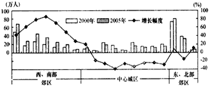 图2:从外来人口规模看,中心城区外来人口数量少于郊区;从外来人口增长幅度看,中心城区人口增长幅度远低于郊区人口增长幅度;郊区中西、南郊区人口增长快于东、北郊区。这有利于上海中心城区的第二产业向郊区转移,有利于城市功能区的优化,有利于促进郊区的城市化进程,有利于减轻中心城区的环境压力(任答一点即可)。