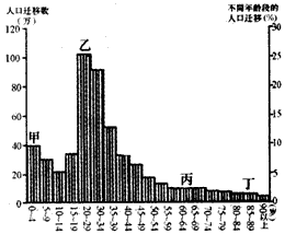 2、图中甲~丁不同年龄段的人口迁移,有明显相关的是