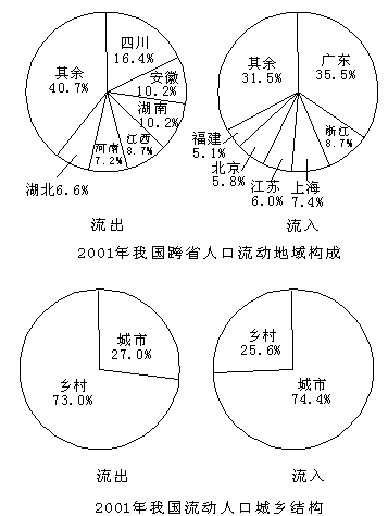 2、综合题 ? 人口迁移和城市化是人类社会发展历程中的重要现象。近年我国流动人口逐渐增加,2001年全国流动人口超过1.2亿。读图,分析回答下列问题。