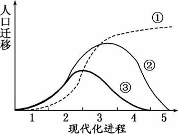 本题解析:本题考查人口迁移知识和学生对图及材料的分析、理解能力。第(1)题,由材料中提到的三种人口迁移类型判断.①代表的类型随现代化进程呈增加趋势,为城市间人口迁移,②先增后减为城乡间人口迁移.③与土地扩张相伴为开拓式人口迁移。第(2)题,由公式可知,迁入城镇第三产业产值与省外移民的响应率呈正相关。外来民工多从事劳动强度大、技术要求不高的产业。