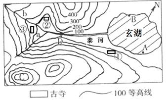 (4)在图中D处拟建—水坝(如图:“‖”),水坝建成后,三座古寺中有可能被水淹的是 (填数字代码),请简要分析其原因。(6分)