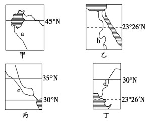 3、单选题 在年降水量不足250毫米、灌溉水源不足的地区,一般不能发展灌溉农业,下图中的甲、乙、丙、丁所示地区都是灌溉农业区。读图回答1—2题。