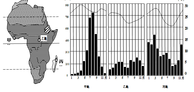 (2) 甲、乙两地虽然气候类型相同,但两地的植被景观却略有差异。从两地全年降水分配差异的角度分析造成这种差异的原因。(3分)