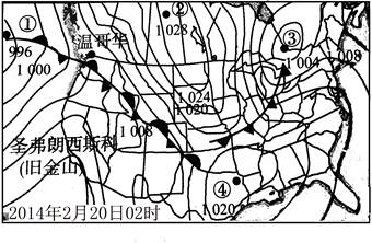 本题解析:图示美国中北部是高气压控制,华盛顿处在冷锋前暖气团控制下,不会出现暴雨;温哥华处在一准静止锋附近,冷锋后,刚刚经历了连续性降雪;圣弗朗西斯科在冷锋前,暖气团控制下,气温没有下降;墨西哥湾沿岸处在高气压中心的南侧,天气晴朗吹偏北风。选B正确。