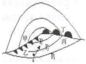 【小题3】我国东南地区盛行东南季风时带来湿润气流,东南季风在①处形成的降水较多。①处等高线密集,坡度大,②处为山谷。所以本题选择B选项。