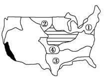 本题解析:1.本题考查美国农业生产的特点。美国农业生产高度现代化和专业化。图中阴影部分为美国的玉米带,②④为美国的小麦带,但因为②④两者所处的纬度位置由差异,②处纬度高,气温低,小麦不能越冬,只能种植春小麦,④处为冬小麦。所以本题选择D选项。