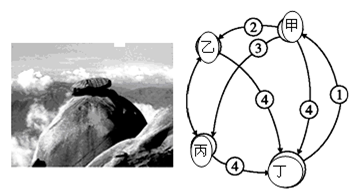【小题1】由题干可知天柱山山体主要由花岗岩组成,花岗岩属于岩浆岩;根据常见地壳物质循环过程可知,在图中“三进一出”的是岩浆,即图中丁,三个箭头指向岩浆,一个箭头指出转化成甲,即岩浆经过冷却凝固形成岩浆岩,故选项A正确。