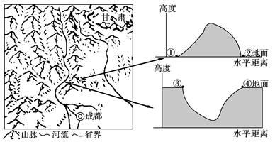 小题2:成都平原地表平坦,是流水的流速降低,泥沙沉积形成的;而地壳下陷、流水侵蚀会使地表崎岖不平,该地海拔低,没有冰川。故选A。