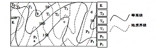 5、单选题 读某地等高线地形图与地质分布图,K-P1代表岩层由新到老。读图完成以下问题。