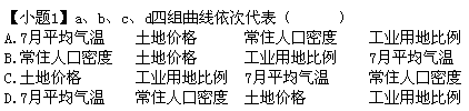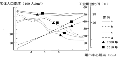 小题1:是我国东部某大城市,a线为7月平均气温曲线,越近市中心地区,温度越高;b为土地价格曲线,越近市中心价格越高,在距市中心4km处上升主要是交通交汇处,地价越高;d是工业用地比例曲线,越近市中心工业用地比例越低,在距市中心2Km处工业用地比例高,应是劳动密集型产业近人口密集区;c为常住人口密度曲线,应在靠近市中心的郊区密度最大。选A正确。
