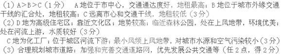 (1)根据图示资料,比较A、B、C三地地租高低,并说明判断依据(4分)