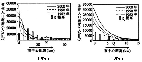 3、单选题 下图为我国东部地区甲、乙两城市三个年份的常住人口密度分布图,图中楼高表示2000年城市商务楼相对高度。读图回答1~2题。