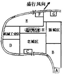 5、综合题 把下图中的英文字母填入下面的表格中(每个空格限填一个字母,每个字母限填一次),使城市用地的功能分区合理化。
