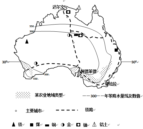 (2)读图,根据图中的等降水量线分布判断,该农业地域类型大致分布在年降水量300至550毫米的地区,主要位于澳大利亚东南部和西南部。该地发展这种农业地域类型的有利的社会经济条件主要有该地区地广人稀、土地租金相对低。位于沿海地区,海陆交通便利,便于出口。靠近人口、城市密集地区,市场广。科技水平高、机械化程度高。
