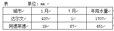 (1)读图,结合表格数据分析,两城市位于南半球,1月是夏季,达尔文纬度较低,受到附近低气压带影响,降水多。阿德莱德主要受副高控制,降水少,所以1月份达尔文降水远远多于阿德莱德。7月南半球是冬季,达尔文受到副高控制降水少,而阿德莱德受到西风带影响降水多。所以7月份达尔文降水少于阿德莱德。