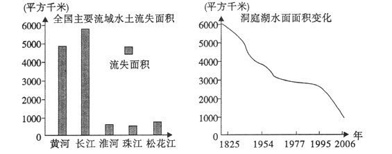 (1)由图中可以看到,左图的两个坐标轴,横坐标表示的是河流,纵坐标表示的是面积,所以这个图表示应该是不同河流的水土流失面积问题;右图则表示洞庭湖面积随着时间而减少,主要原因是由于长江的水土流失带来了泥沙而造成的。