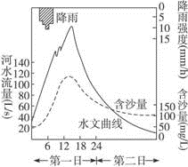(1)假设暴雨发生时该河盆的森林早已砍伐,试在图中绘出可能出现的河流流量曲线及含沙量曲线。