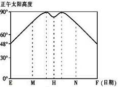 小题1:根据题意,图中E(F)、H 处是二至日,M、N为二分日。该地一年中正午太阳高度有两日为90°,说明该地一年内有两次太阳直射现象,应位于南、北回归线之间,南、北回归线上一年内只有一次太阳直射现象,所以排除选项C、D。H日正午太阳从正北方向照射,说明该地位于北半球,H日为夏至日,A项符合题意。