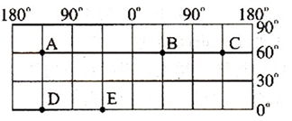 1、单选题 读所给经纬网图,回答问题。