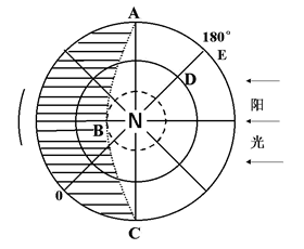 (2)根据图中北极圈及其以北地区出现极昼,所以直射点的纬度是23°26′N,根据0°经线和180°经线的位置,推断直射点的经度为135°E。