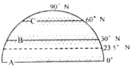 C的名称是?; 气压带A与B之间是?带; 气压带B与C之间是_____? ____带,在图中画出风向。(12分)