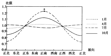 1、单选题 下图表示“27。N某地坡向(坡度为10。)对地表获得太阳辐射的影响”,纵坐标表示该地坡面与地平面获得太阳辐射量的比值(仅考虑地球运动和地形因素)。完成下面1~2题。