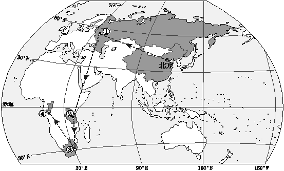 4、单选题 2013年3月22~30日,中国国家主席出访了俄罗斯、坦桑尼亚、南非和刚果共和国四国,下图是出访路线示意图。据图文回答下列各题。