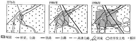 3、单选题  读某地区三个时间段城市发展变化图,回答下列各题。