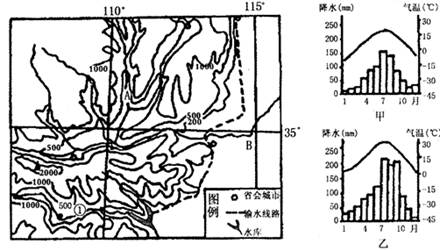 (1)根据图中的经纬度和等高线图分析,①处位于秦岭淮河以南地区,为亚热带季风气候区。乙图表示亚热带季风气候,冬季气温高于0℃。