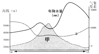 【小题1】读图,海拔高、 降水少的区域,年日照时数应较多,而甲山顶附 近对应的 a 曲线数值不如山麓地带高,A错。随着海拔的升高气温降低,≥10 ℃积温减小,a 曲线在山地区等值线平直,B错。该地位于赤道附近,东北信风和东南信风在赤道附近辐合上升,容易形成降水,7月,山地的东南坡是迎风坡,降水较多,a 曲线东南坡数值较西北坡应较大,C错。西北坡地处背风坡,降水较少,蒸发量较大,曲线 a表示的气象要素可能是年可能蒸发量 (mm),D对。