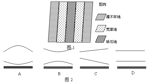 2、单选题 图1为北半球某地地面状况示意图,7月份该地天气晴朗、稳定少变,则该地白天因热力原因形成的等压面分布状况如图2中 图所示。