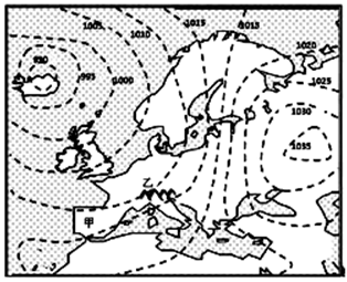 【小题2】据图可知:此时海洋上形成低压中心,亚欧大陆上形成高压中心,因此,该季节为北半球的冬季,由于甲地为地中海气候,冬季受来自海洋的盛行西风影响,气候温和湿润,所以本题C正确。