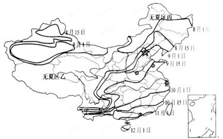 2、单选题 我国国土辽阔,面积广大,各地同一季节开始的日期有所不同。下图是我国正常年份秋季开始日期分布图,据此回答29—30题。