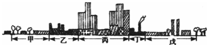 小题1:结合图示的景观分布,丙部分在城市中心,建筑物高大密集,为商业区,办公楼位于商业区。商店主要分布于丙区;丁、戊有烟囱,有绿化带与其他区域隔开,属工业区,甲、乙区的楼房在最外围,楼房相对中心区矮、稀疏,属住宅区,地租也最低。故选C。