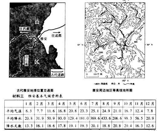 材料一?雅安市是中国四川省中部偏南下辖的地级市,位于青衣江中游,素有“川西咽喉”、雅安自古多雨,有西蜀天漏之说,俗语“雅无三日晴”,号称雨城。雅安多山,岩石多为页岩,易风化,表土层深厚,矿物质丰富,土壤呈酸性。雅安盛产茶叶,是有名的“边茶之乡”。自雅安经康定入藏的道路为“茶马古道”的一部分。?