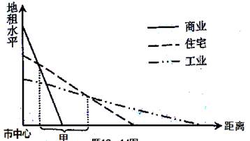 小题2:因甲范围中,住宅的付租能力最高,而商业区、工业区和农业区的付租能力低,所以该范围内形成住宅区。故选B。