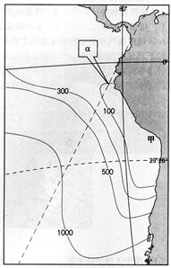 (2)从图示等值线分析,甲海域年降水量较 (大/小),主要原因是 。(3分)