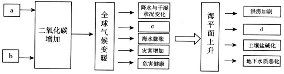 (3)根据全球气候变暖成因与危害之间的关系,填出下列空格中各字母所表示的内容。