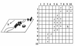 3、单选题 左图是一幅有林木、河流和房屋的地图,右图是根据左图而建立的空间数据模型。据此回答下列问题。