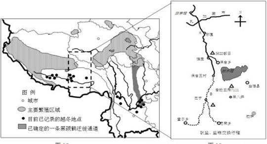 (2)请描述青藏高原黑颈鹤越冬地点的分布规律,并分析黑颈鹤能够在这些地区越冬的原因。(6分)