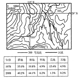 1.结合表格从1978年到2008年的土地利用结构变化反映:耕地比重下降;林地比重上升;草地比重略有上升;荒地面积减少,故推理该地区实施了退耕还林还草,植被覆盖率有所上升。故B项正确。