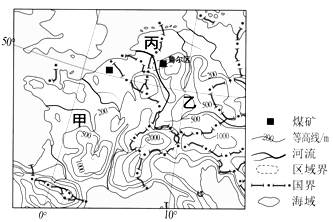 【小题2】乙为德国,由于技术水平的不断提高,钢铁业的发展对煤炭和铁矿布局区位需求量逐渐减少,对市场的需求逐渐增加。所以乙国将炼钢高炉从鲁尔区搬迁到丙国的海边,其主要目的是就近获得进口的铁矿石,要沿海加工,便于出口产品。选B正确。