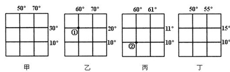 点评:本题的关键是考生知道比例尺的大小与实际面积之间的关系:在图幅面积相同的情况下,实际面积越小,比例尺越大。同时也要求考难迅速地利用经纬度的跨度大小判断出甲、乙、丙、丁四幅的实际面积的大小关系。试题属于中档题型。