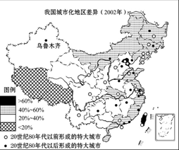 本题解析:A项东部各省除河北省城市人口比重均在40%以上;错误。B项新增的特大城市东部达8个,而中部有7个,故B项错误。C项西南地区只有新疆的城市人口比重在20%以下;错误。D项图示反映我国城市人口比重基本呈自东向西递减的趋势;这与我国的经济发展基本一致;故选D项。