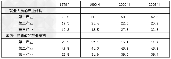 2、单选题 读中国三大产业就业结构和产值结构表(% ),回答1—2题。