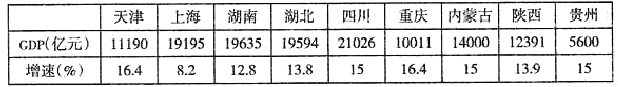 小题1: 结合表中信息,可以直接将B排除;重庆增长速度与天津相同,而发展条件不如东部沿海地区的上海、天津等地,排除C选项;上海的经济增长速度虽然最慢,但其经济增长仍是正值,人均GDP应该提高,而非降低。
