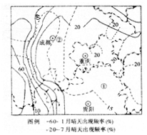 小题1:比较两图可知,晴天出现频率最大地区在图示范围的西部,该地位于横断山区,其1月晴天出现频率为 70%~80%,7 月为 5%~10%,所以其变化幅度为 60%~75%。