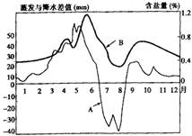 3、单选题 读华北平原某地蒸发与降水差值(即多年平均蒸发量—多年平均降水量)曲线和表层土壤含盐量季节变化曲线图,回答问题。