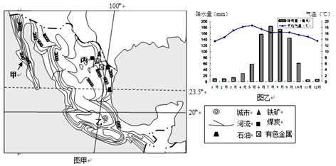 材料一?某国等高线地形(图甲)和乙城市气候资料图(图乙)