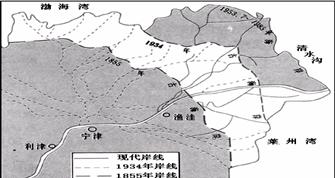 4、综合题 材料一黄河是一条多沙的河流,中上游每年输出泥沙16亿吨,经河口入海的约有12亿吨。而黄河在利津入海口的潮流作用很弱,河口潮流的落差通常只有0.8~1.0米。由于潮流弱、搬运能力差,黄河入海的泥沙约有40%在河口附近淤积,河口两侧的堆积体以每年2~3千米的速度向海洋延伸,黄河三角洲也以很快的速度向海洋扩展。